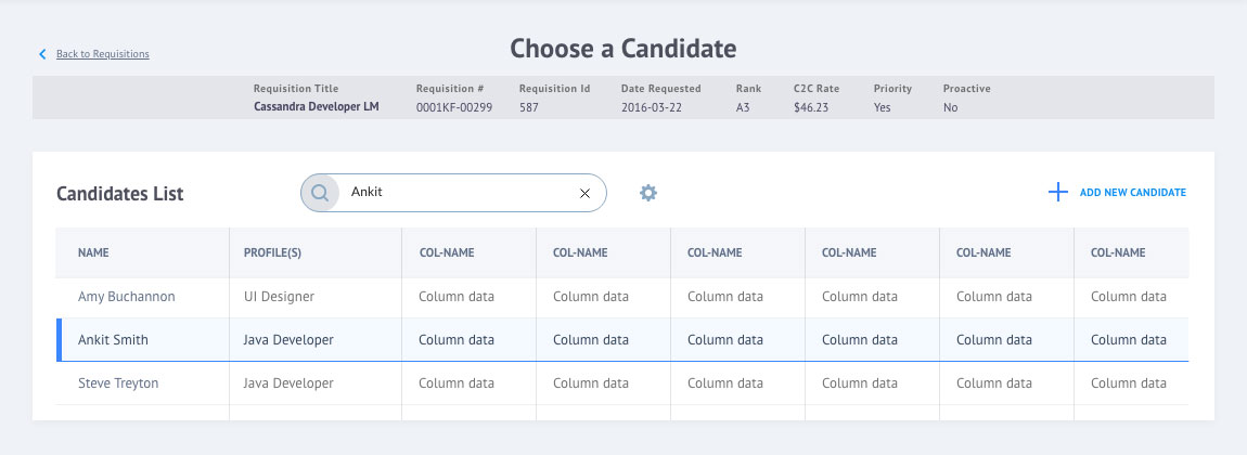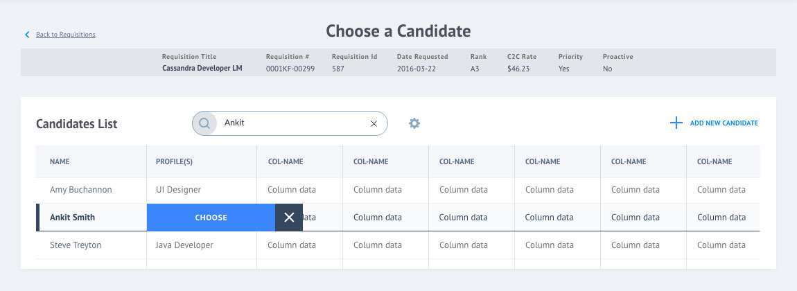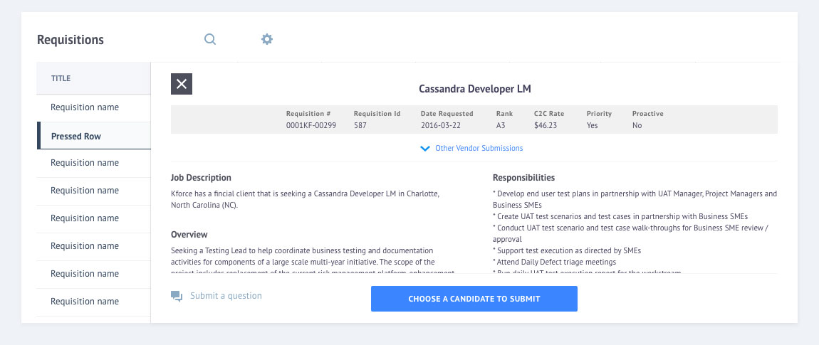 I wanted to make exploring multiple requisition details quick and seamless. The slide out UI allows users to view the requisition details without leaving the table. It's essentially a pop-up that slides out from the right side of the table that includes an option to choose candidates to submit.